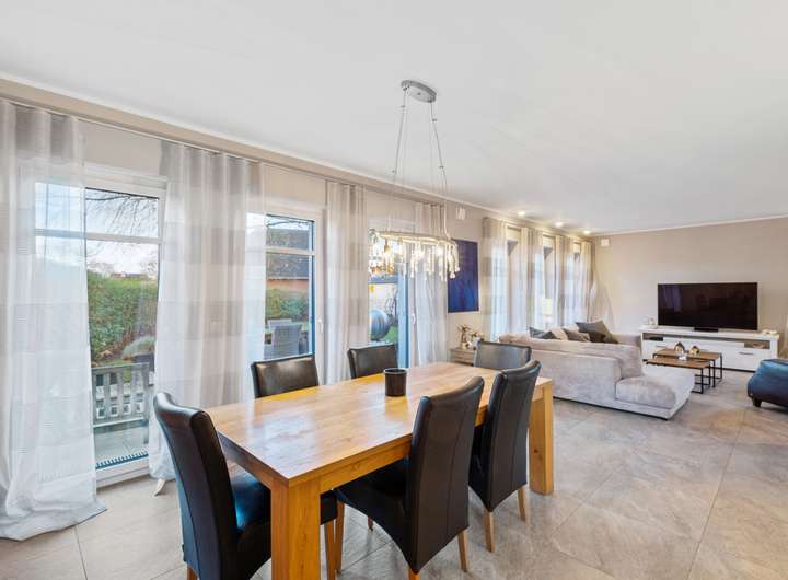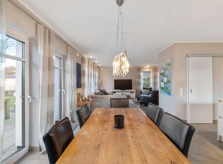 _L-förmiger Wohn-Essbereich (ca. 50 m²) mit bodentiefen Fenstern, Zugang zur Terrasse und Garten