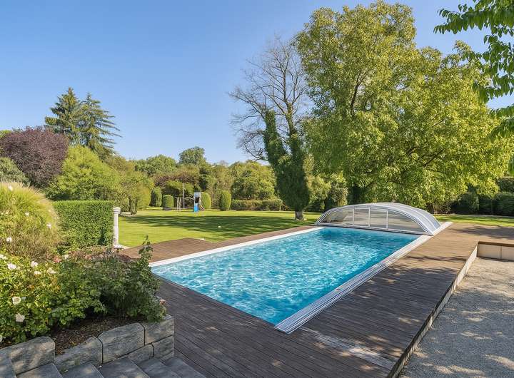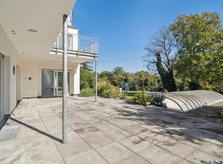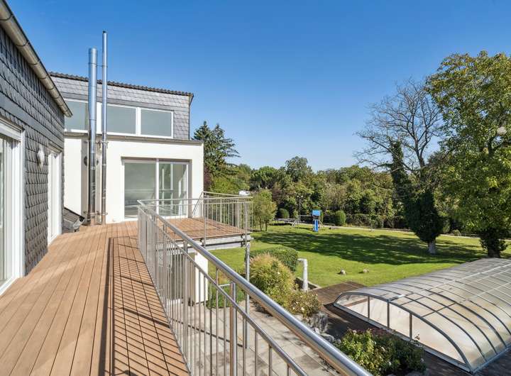 Der Außenbereich bietet mit einem beheizbaren Pool samt Gegenstromanlage, einer Gartendusche sowie einem automatisierten Bewässerungssystem höchsten Freizeitwert. Der parkähnliche gestaltete Garten, dessen Mittelpunkt ein prächtiger Walnussbaum bildet, schafft eine grüne Oase inmitten der Stadt.