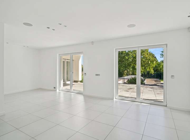 Das Erdgeschoss bildet den zentralen Treffpunkt des Hauses. Hier verschmelzen Essen und Wohnen zu einem großzügigen, offenen Lebensraum, der durch bodentiefe Fenster, eine elegante Miele-Einbauküche und einen Gaskamin eine besondere Atmosphäre schafft. Zwei Schlafzimmer, ein Badezimmer sowie ein Gäste-WC bieten bereits auf dieser Ebene hohen Wohnkomfort. Die weitläufige Terrasse mit Süd-Ost-Ausrichtung erweitert den Innenraum ins Grüne und schafft einen fließenden Übergang zum Garten.