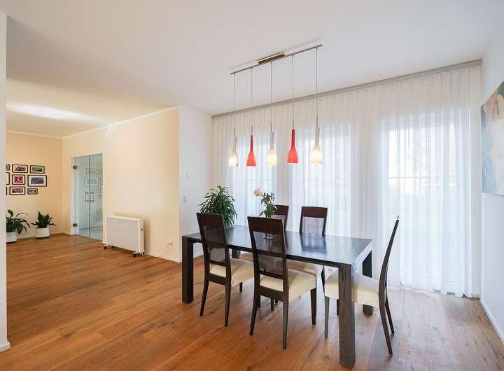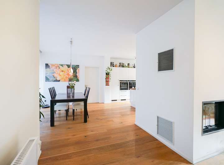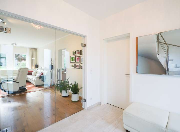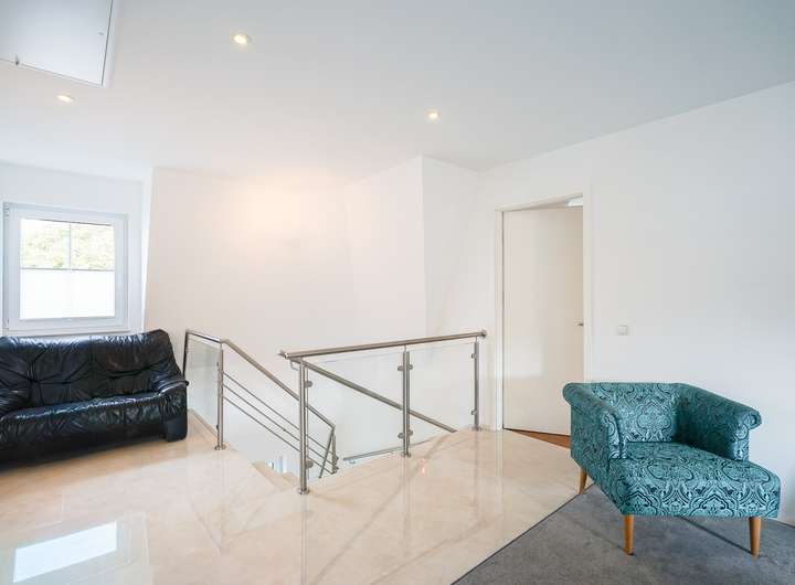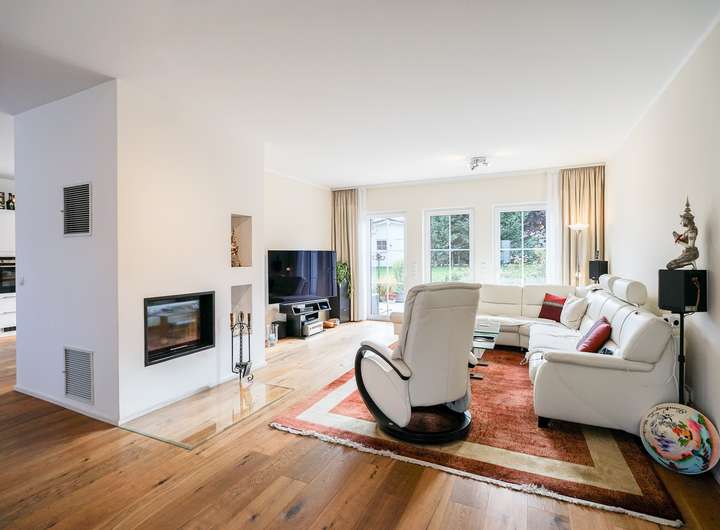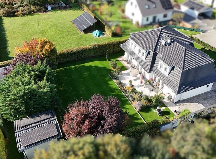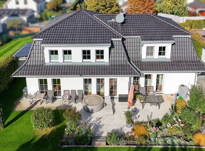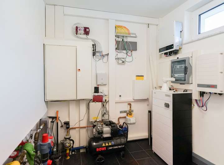 Edles Eichen- und Nussbaumparkett, großformatiges Feinsteinzeug sowie italienische Fliesen prägen das elegante Ambiente. Fußbodenheizung in beiden Geschossen, eine sehr effiziente Weishaupt-Gastherme, 1.000-Liter-Pufferspeicher mit 6kW-Heizstab und ein wassergeführter Kamin sorgen für effiziente Wärme. Eine 16,5 kWh Solaranlage produziert ganzjährig deutlich überschüssig Strom, welcher in einem 13 kWh-Batteriespeicher zwischengespeichert wird. Smart-Home-Steuerung, Alarmanlage, Glasfaseranschluss, Wallbox und Grander-Wasseranlage im ganzen Haus mit separatem Live Plus Carbon Trinkwasserfilter runden die moderne Ausstattung ab.