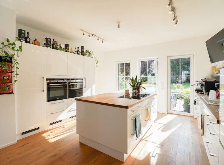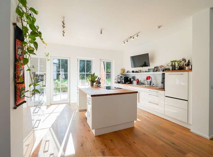 Die große, offene Einbauküche ist mit allen hochwertigen Großgeräten ausgestattet und verfügt über eine zentrale Kücheninsel, die als kommunikatives Herzstück des Hauses dient – ideal für geselliges Kochen und stilvolles Wohnen.