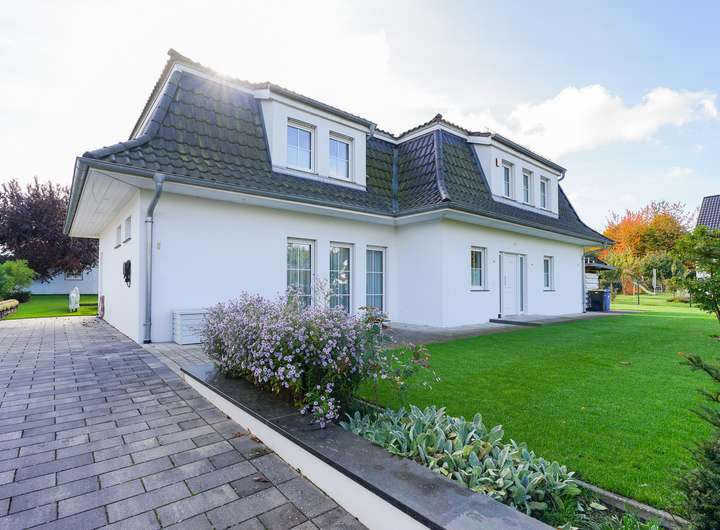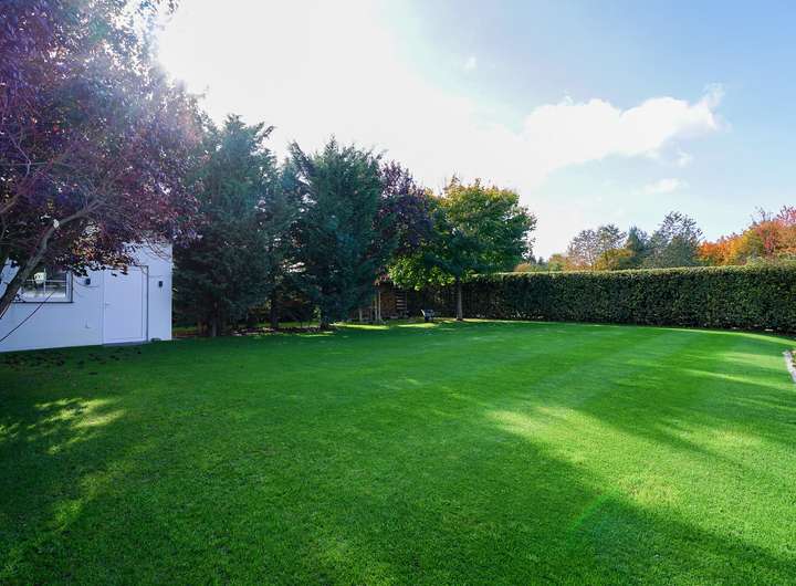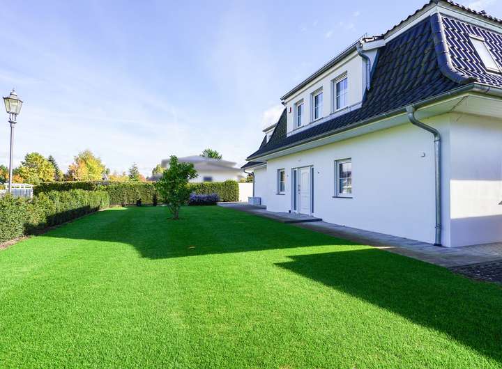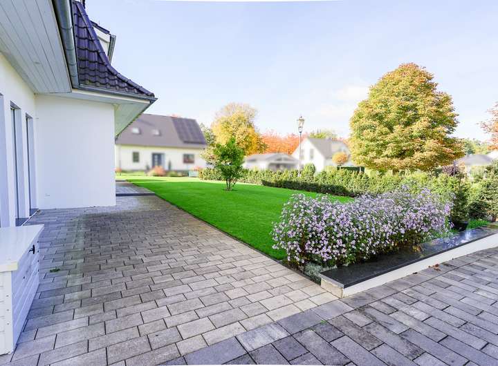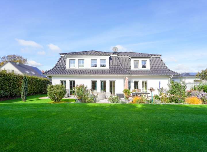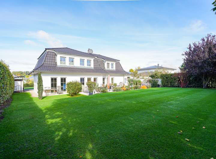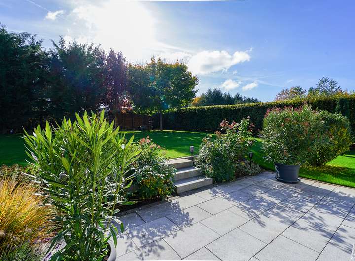 Der nach Süden ausgerichtete, uneinsehbare Garten mit englischem Rasen bietet Sonne, Ruhe und ein Höchstmaß an Privatsphäre. Duftrosen säumen die großzügige Terrasse. Die automatische Bewässerungsanlage, ein massives Gartenhaus (ca. 16 m²) und drei Stellplätze komplettieren das Ensemble.