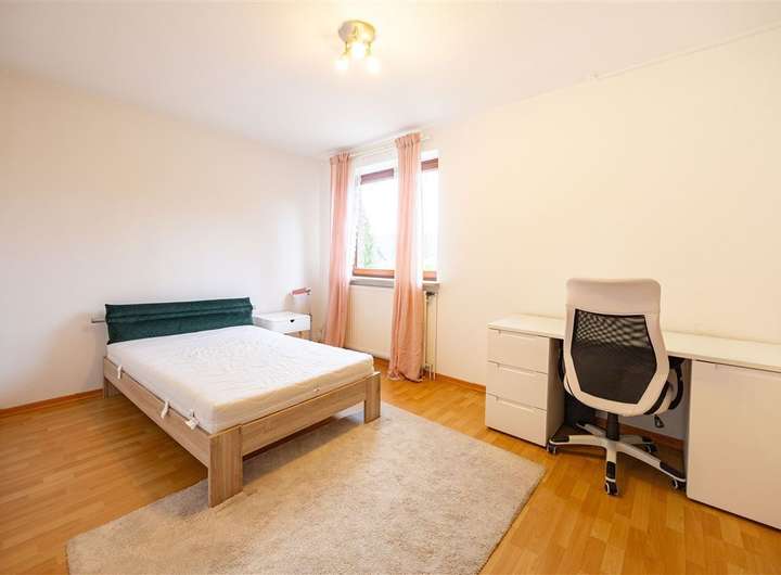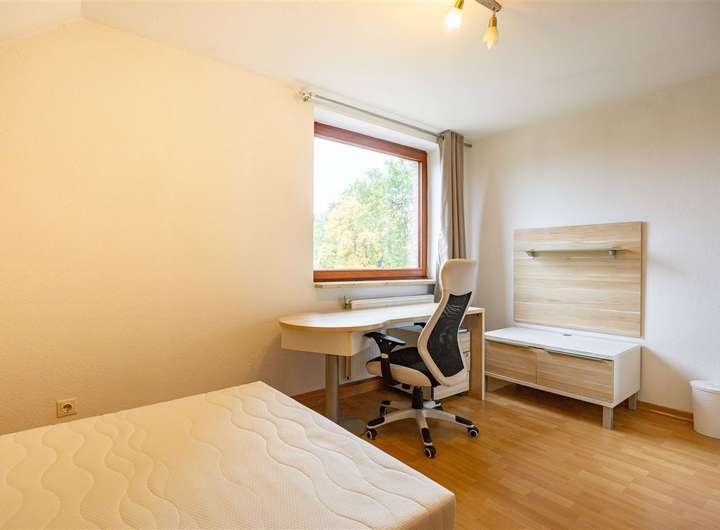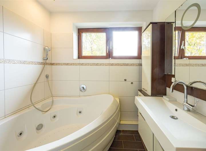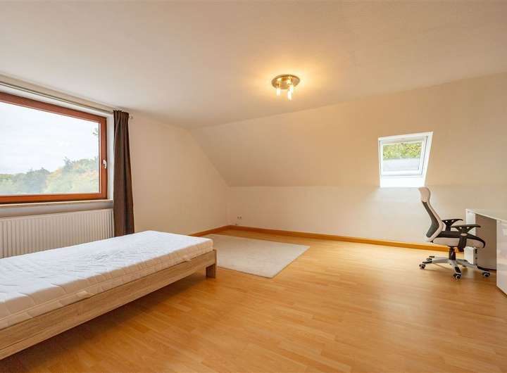 Im Obergeschoss befindet sich zwei gleichgroße Zimmer zur Gartenseite, sowie ein Zimmer nach Nord-Osten ausgerichtet. Ein Badezimmer mit Whirlpool und großen Fenstern und ein weiterer Abstellraum sind von hier ebenfalls zugänglich.