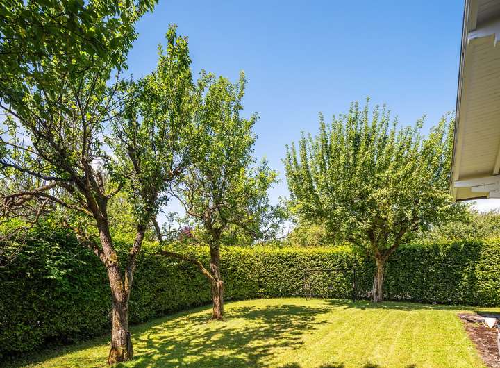 Die in das Wohnhaus integriert große Garage bietet Platz für 2 Fahrzeuge einschließlich Gartengeräte und Fahrräder. Der Garten ist als Grünfläche mit Aufwuchs von Blumenbeeten, Rasenflächen, Ziersträuchern und Obstbäumen angelegt.