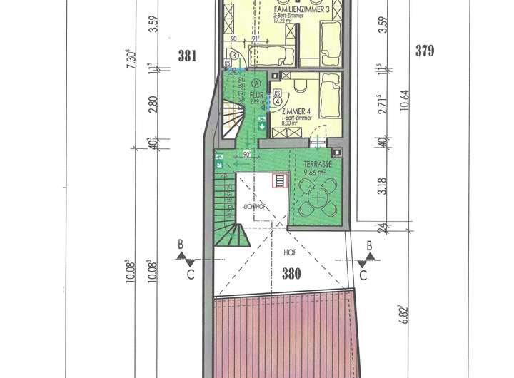 Die kompakte Wohnfläche von ca. 98 m² erstreckt sich über 3 Etagen, wobei das Obergeschoss über eine Außentreppe im überdachten Innenhof zugänglich ist.