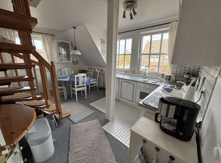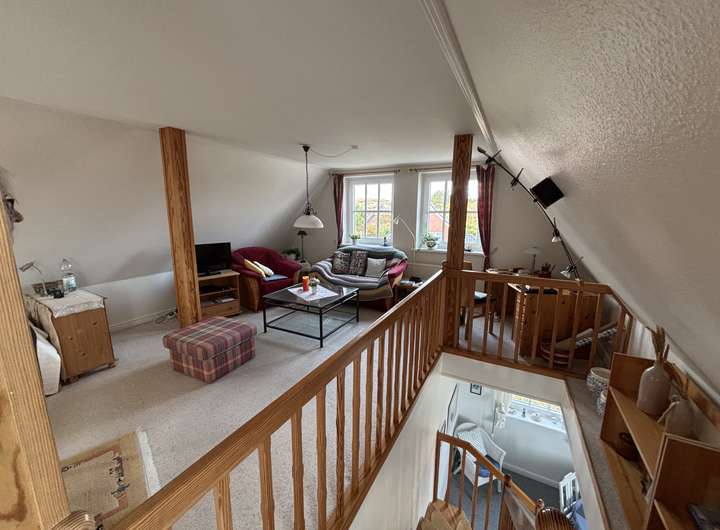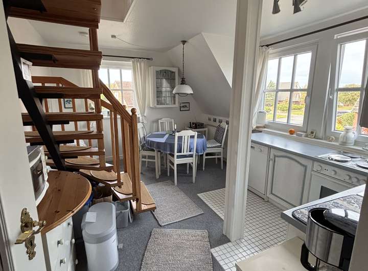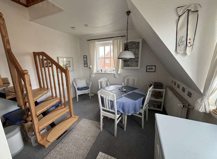 Gemütliches Wohn-/Esszimmer mit voll ausgestatteter Küchenzeile und Essplatz mit 4 Sitzgelegenheiten, Duschbad/WC mit Tageslicht, einladende Diele mit Garderobe. Eine offene, gut begehbare Holztreppe mit Handlauf führt in den Spitzboden. Dort befindet sich ein geräumiger, heimeliger Raum mit mehreren Fensterflächen.
