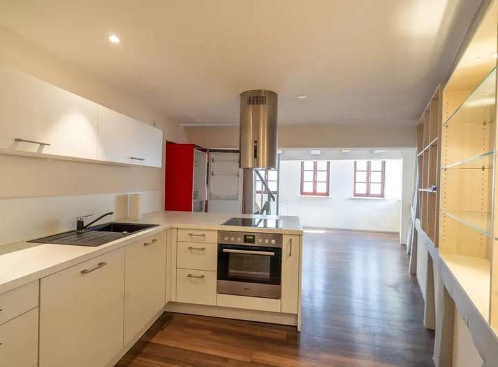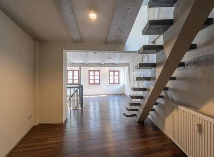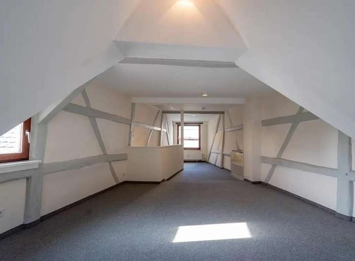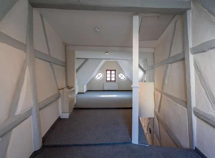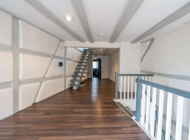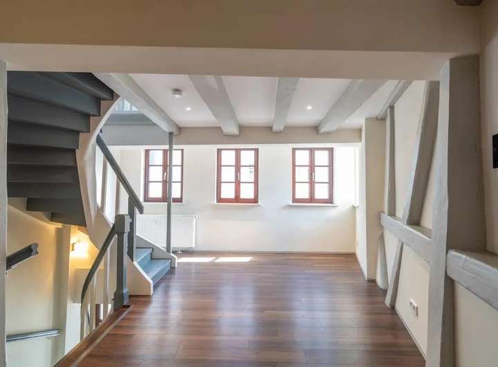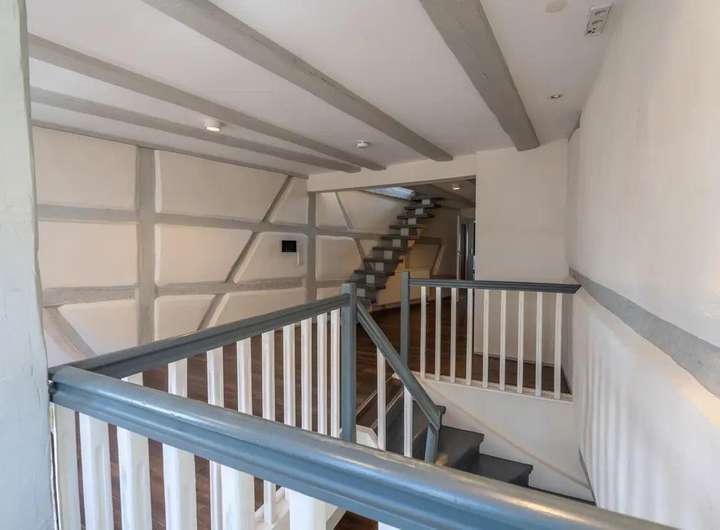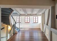 Das viergeschossige Gebäude besticht durch seinen offenen Grundriss, liebevoll erhaltene Fachwerkdetails und hochwertige Schreinereieinbauten, die dem Haus eine einzigartige Atmosphäre verleihen.