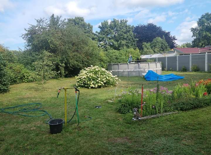 Ortsüblich erschlossen ohne nennenswerten Baumbestand oder anderen Einschränkungen . Bebaut mit einer 40 Jahre alten Gartenlaube aus DDR Zeiten, kann also abgerissen werden.