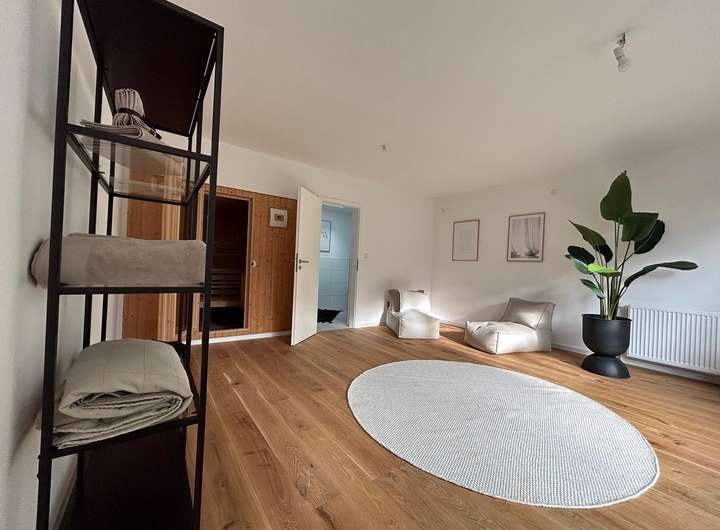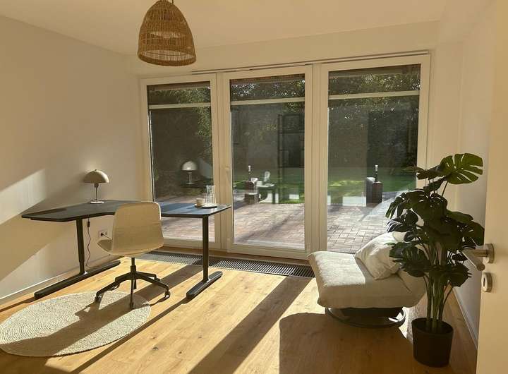 Das Erdgeschoss bietet viele große und lichtdurchflutete Wohn-, Arbeits und Freizeiträume. Alle haben einen direktem Zugang in den großen, grünen Garten, der von außen nicht einsehbar ist. Die schöne Wellnessoase bietet neben einer gemütlichen Sauna auch ein voll ausgestattetes Badezimmer und eine große und gemütliche Entspannungszone. Gleich nebenan findet sich Platz für einen kleinen Fitnessbereich. Sport, in die Sauna, Entspannung und eine warme Dusche - und das im eigenen Zuhause. Besser geht es nicht!