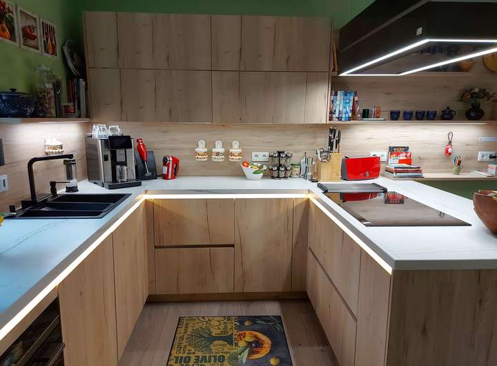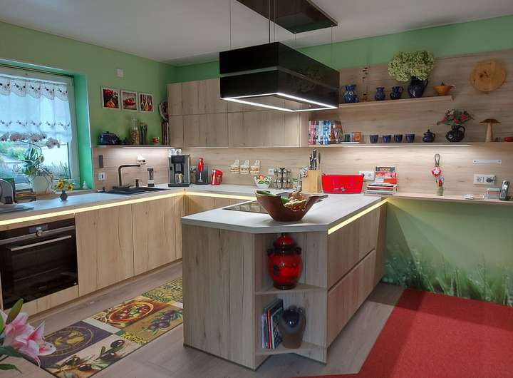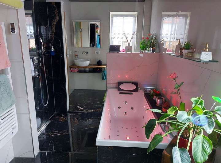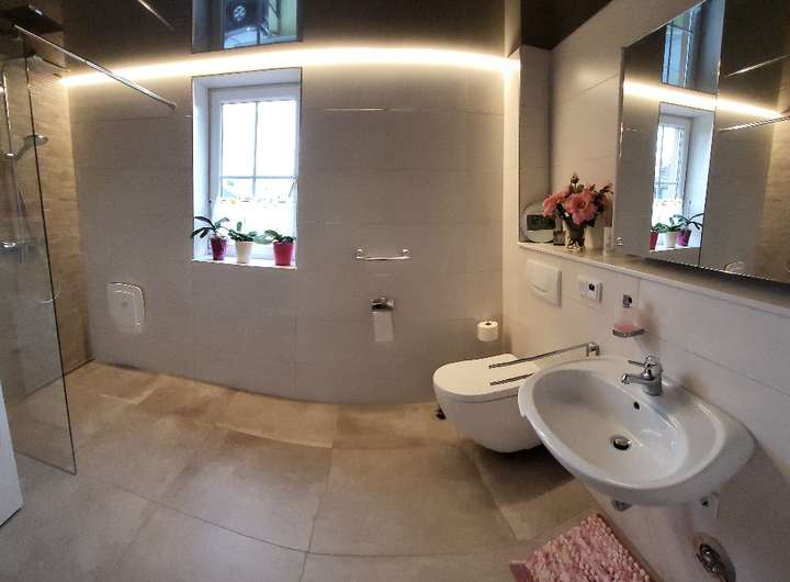 Im EG befindet sich ein großzügiger Wohn-/Essbereich mit hochwertigem 8 kW Hark-Kaminofen mit Backrohr, eine Design-Einbauküche (2022) mit großem Induktionskochfeld, Lifthaube, Siemens-Geräten mit Dampfbackofen, LED-beleuchteten Einbauschränken mit viel Stauraum sowie ein Wellnessbad mit Whirlpool-Wanne und Lichttherapie, begehbarer Dusche, Dusch-WC, zwei Waschplätzen, elektrischer Fußbodenheizung und edlen Marmoroptik-Fliesen, ein Schlafzimmer und Flur.