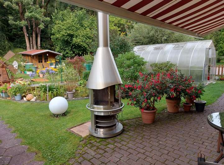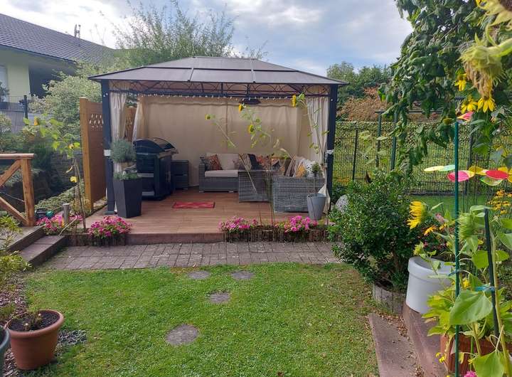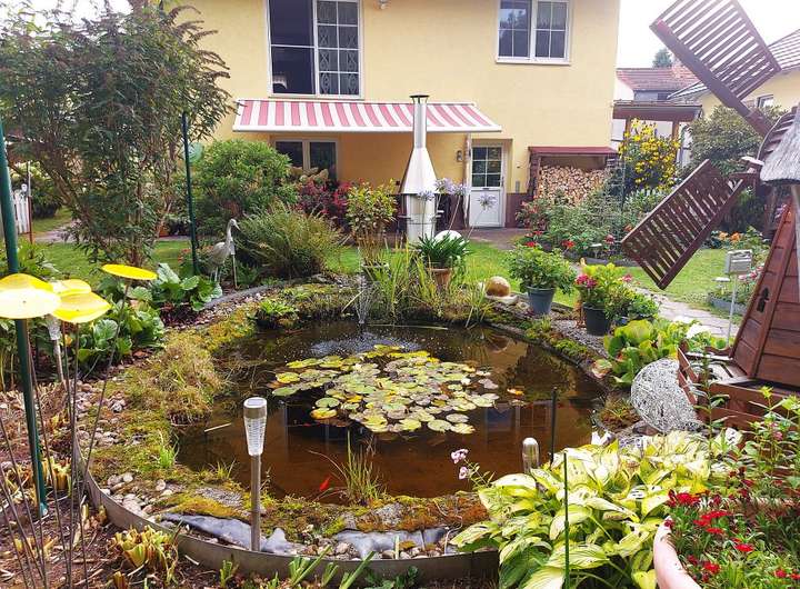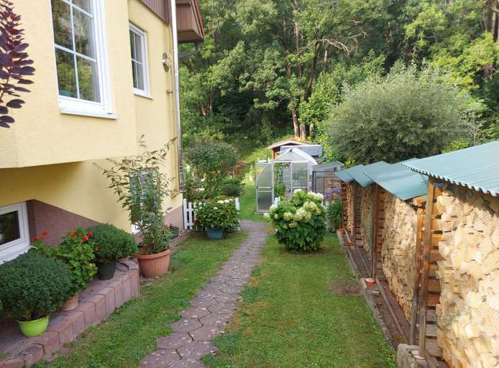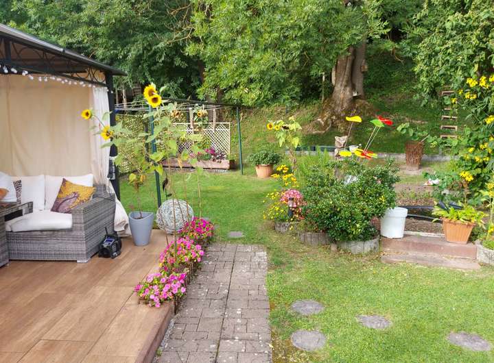 Der liebevoll gestaltete Garten umfasst drei Terrassen (eine mit Pavillon und Strom), ein beheizbares Gewächshaus, Gartenhaus mit Strom, Kunststoffgerätehaus, Bachlauf mit Steg und Brücke, Teich, Gehölzen, Pflanzen und Außensteckdosen. Ein Carport und vier PKW-Stellplätze runden das Angebot ab.