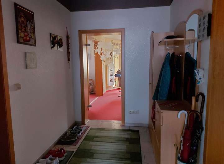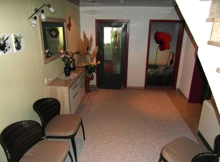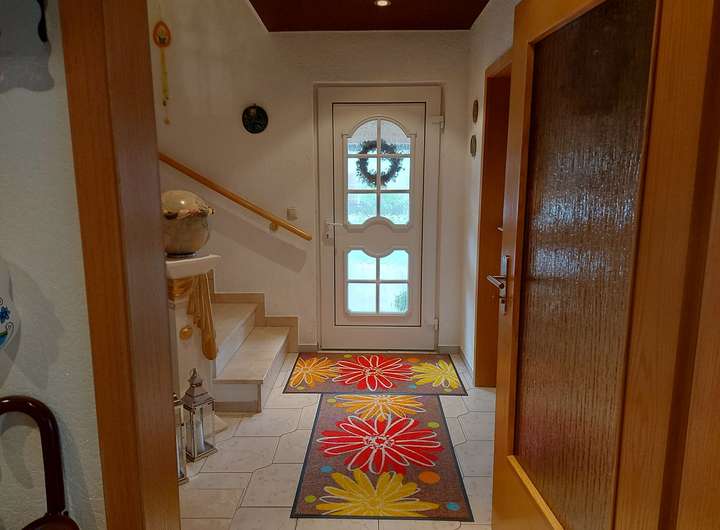 Diele, der Ausgangsraum (Zugang zum Garten) mit Einbauschränken und kleinem Bad (Dusche, WC, Waschplatz, Fußboden- und Infrarotheizung).