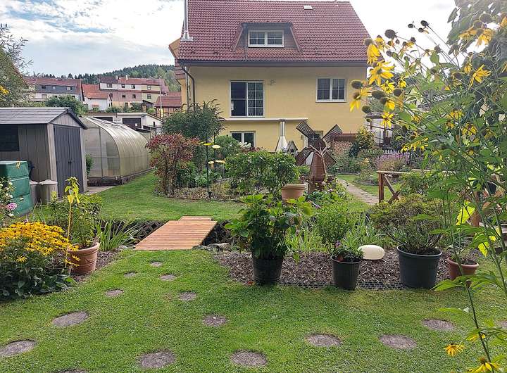 Auf rund 180 m² Wohnfläche und einem 700 m² großen Grundstück entfaltet sich ein harmonisches Zusammenspiel aus Architektur und Natur. Das Grundstück mit querendem Bachlauf, der auch im Sommer nicht versiegt, ein kleiner Teich und mehrere Terrassen schafft eine Atmosphäre, die zum Verweilen einlädt – ob mit Familie, Freunden oder ganz für sich allein. Das Haus mit durchdachter Raumaufteilung über drei Etagen bietet Platz für gemeinsames Leben ebenso wie für individuelle Entfaltung: Arbeiten, Entspannen, Kreativsein – alles unter einem Dach.