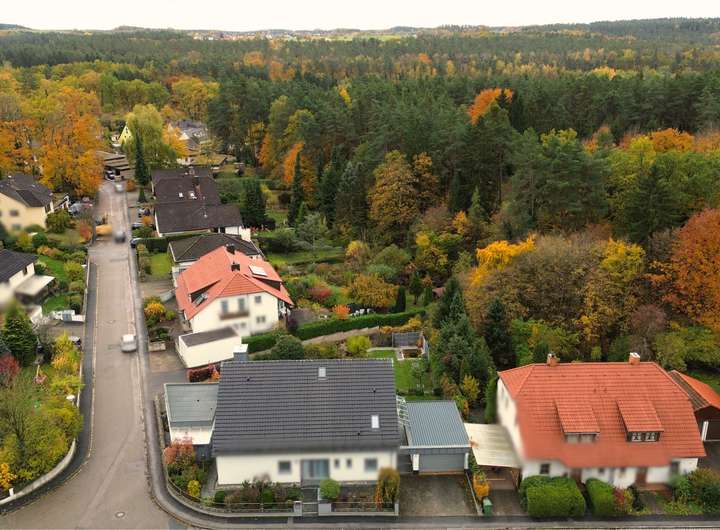 Das Grundstück befindet sich in einem gepflegten Wohngebiet in Burgthann, einer ruhigen und angenehm gewachsenen Wohnlage innerhalb des Nürnberger Lands. Das Umfeld ist überwiegend durch gepflegte Einfamilienhäuser, Doppelhaushälften und kleinere Wohnanlagen geprägt und vermittelt eine harmonische, familienfreundliche Atmosphäre. Das Grundstück wird durch eine von Anlieger befahrenen Straße erschlossen, welche wenig befahren ist und zu einer sehr ruhigen Wohnsituation beiträgt.