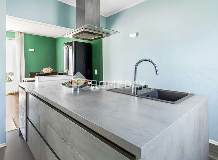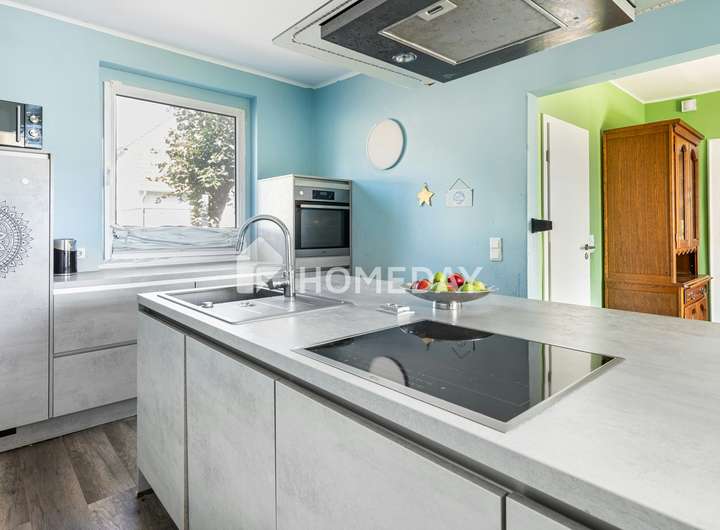 Das Herzstück bildet das helle Wohnzimmer, in dem ein Kaminofen an kühlen Tagen für wohlige Wärme sorgt. Große Fensterfronten öffnen den Blick in den Garten und sorgen für ein angenehmes Wohngefühl. Direkt angrenzend befindet sich die offene Küche mit moderner Einbauküche, Kücheninsel und hochwertigen Markengeräten – ideal, um gemeinsam zu kochen und Zeit zu verbringen.