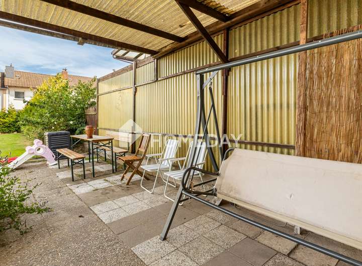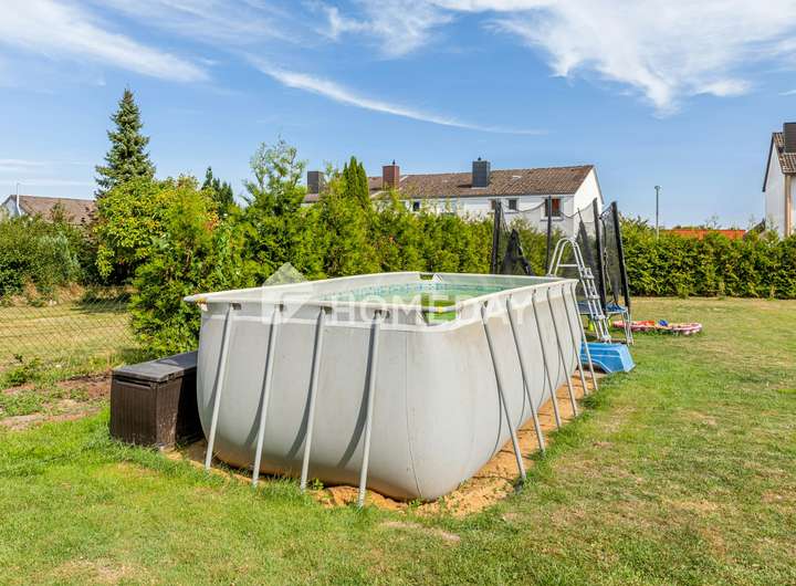 Auch der Außenbereich überzeugt: Eine überdachte Terrasse mit Windschutz, ein gepflegter Garten sowie ein Pool laden zu erholsamen Stunden unter freiem Himmel ein. Für Fahrzeuge stehen zwei Garagen und zwei weitere Stellplätze zur Verfügung. Ergänzt wird das Raumangebot durch einen praktischen Abstellraum und einen Keller.