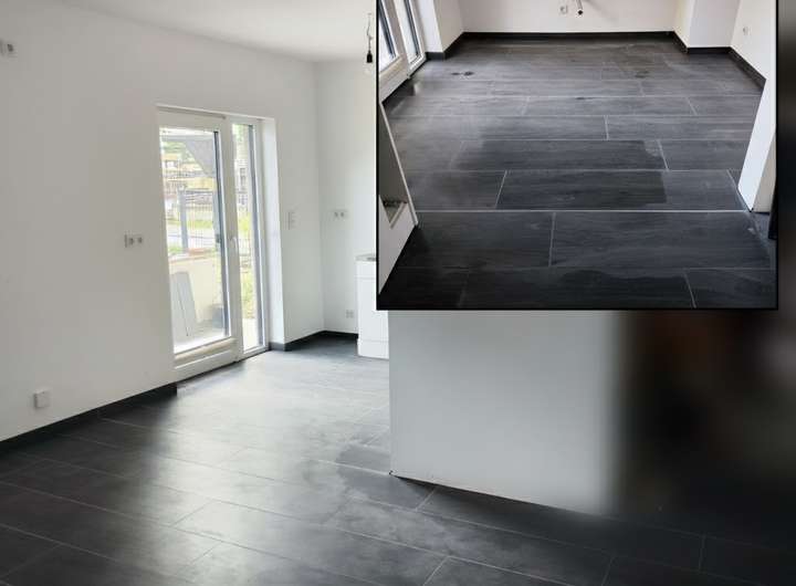 -Großformatige, dunkelgraue Bodenfliesen in Diele, Esszimmer, Küche und Bädern.