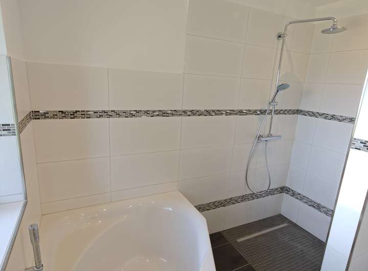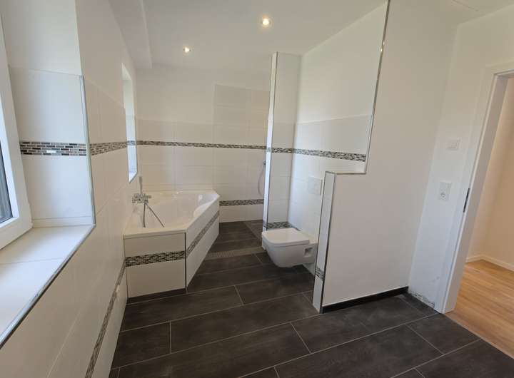 -Attraktives, hochwertiges Badezimmer mit Wanne, bodentiefer Dusche, Waschtisch und Hänge-WC. Ein elektrischer Handtuchheizkörper sorgt für angenehme Wärme.