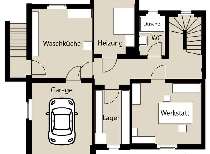 Hier befinden sich Waschküche, Heizungsraum, zwei Kellerräume, Garage und ein Duschbad (bodentiefe Dusche,
