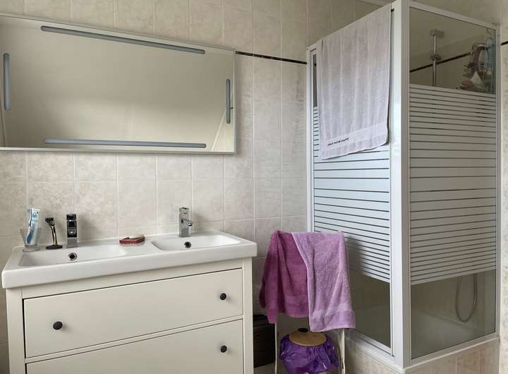 Der lichtdurchflutete Wohn-/Essbereich ist mit Parkett versehen und gestattet einen erholsamen Blick in den reizvollen Garten. Großzügige Terrassentüren und Fenster lassen von morgens bis abends viel Licht einfallen. Die moderne Einbauküche, die direkt an den Wohnraum grenzt, bietet Hobbyköchen einen Herd mit Ceranfeld, Dunstabzugshaube, Kühl-Gefrierkombination, Spüle sowie ausreichend Schränke und Glashängeschränke. Eine kleine Frühstückstheke im Farbton der Arbeitsplatte sieht chic aus und rundet das Angebot ab. Das Gäste-Bad im Erdgeschoss verfügt zusätzlich über eine weiße Dusche.