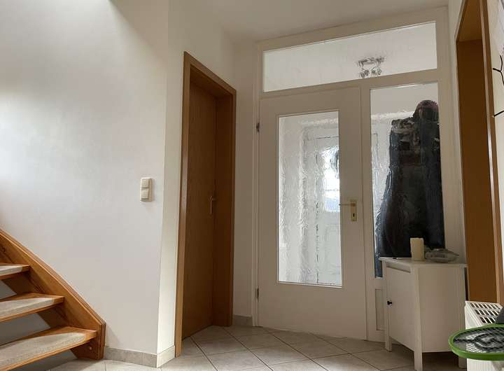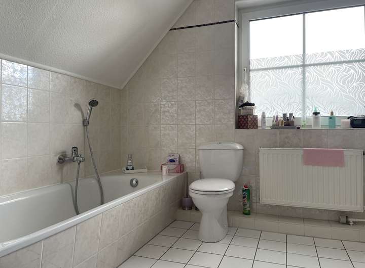 Im hellen Eingangsbereich führt eine Holztreppe zu den weiteren 3 Zimmern und dem komfortablen Vollbad. Das hell geflieste Badezimmer ist mit weißen Badeinbauten wie Waschbecken, WC, Dusche und Badewanne versehen. Ein Fenster sorgt für eine optimale Ausleuchtung.