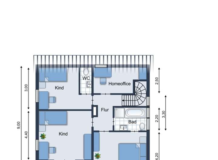 Eine gewendelte Betontreppe führt ins Obergeschoss, das ein schönes Raumprogramm für eine Familie mit 2 Kindern bietet. Es stehen 3 Zimmer, ein Tageslichtbad und ein separates WC zur Verfügung. Ideal: Zwei der Schlafzimmer bieten Zugang zum Südbalkon.