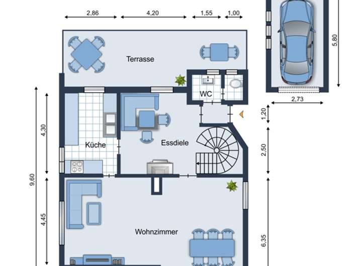 Das Erdgeschoss bietet einen Eingangsbereich mit integrierter Garderobe und einem Gäste-WC. Geradeaus gelangen Sie in die wunderbar große Essdiele, diese ist mit einem offenen Kamin versehen - perfekt für gemütliches Zusammensein am großen Esstisch. Diesem schönen Bereich schließt sich auf der einen Seite die Küche an (perfekt: hier gibt es einen Zugang nach draußen) sowie der großzügige Wohnbereich. Auch dieser bietet Ihnen reichlich Platz - nicht nur für Ihre Wohnlandschaft und TV-Möbel , sondern auch für einen weiteren großen Esstisch. Vom Wohnbereich gelangen Sie zur straßenseitigen Südterrasse, von der Essdiele und der Küche aus zur Nordterrasse Richtung Garten.