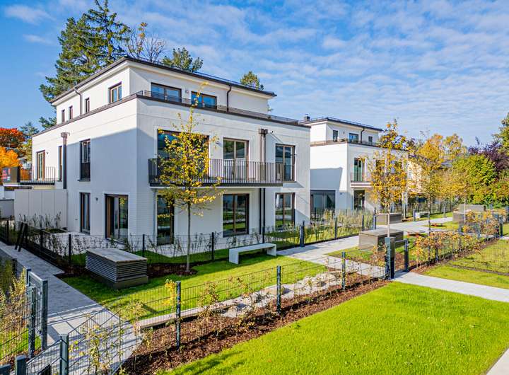 In der Waldschulstraße entsteht bis Herbst 2025 ein Ensemble aus drei eleganten Mehrfamilienhäusern mit nur 13 Wohnungen sowie 6 Doppelhaushälften.