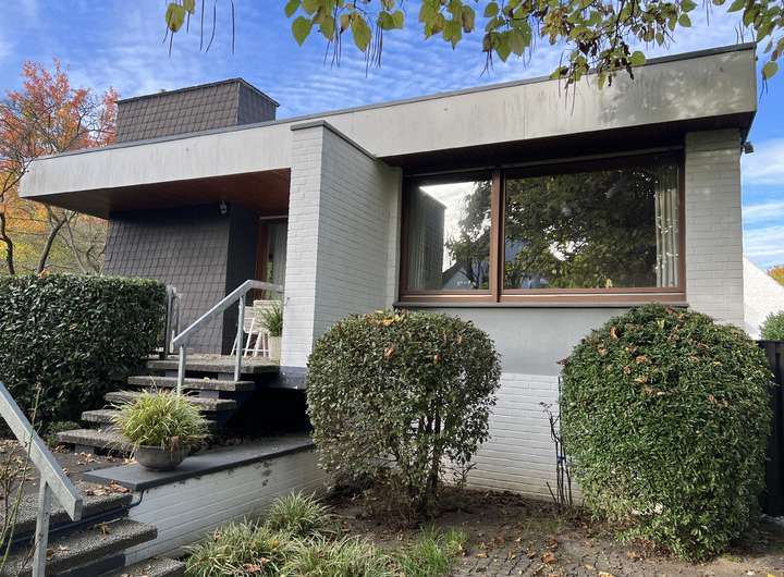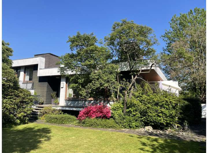 Dieses freistehende Einfamilienhaus aus dem Jahr 1972 präsentiert sich als architektonisch reizvolle Immobilie mit Split-Level-Grundriss, großzügigem Raumangebot und einer traumhaft grünen Lage. Das Anwesen kombiniert den Charme Mid-Century-Baustils mit einem vielfältig nutzbaren Raumangebot - ideal für Familien, die viel Wohnfläche, Ruhe und Natur gleichermaßen schätzen. Bereits bei der Ankunft fallen die großzügige Einfahrt mit ausreichendem Platz für mehrere Fahrzeuge sowie die überlange Garage ins Auge. Diese unterstreichen den großzügigen Charakter des Hauses.