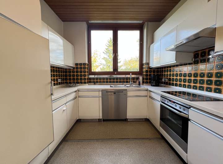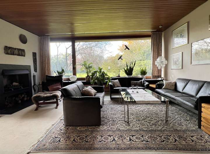 Das Wohn- und Esszimmer ist offen gestaltet und der zentralen Treffpunkt des Hauses. Sie finden dort große Fensterfronten mit Blick ins Grüne, einen gemütlichen, offenen Kamin sowie einen Essplatz für schöne Stunden mit Freunden und Familie. Die angrenzende Küche ist funktional gestaltet und bietet direkten Zugang zu einem praktischen Vorratsraum - ideal für die Aufbewahrung von Lebensmitteln und Haushaltsutensilien.