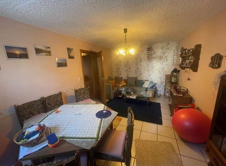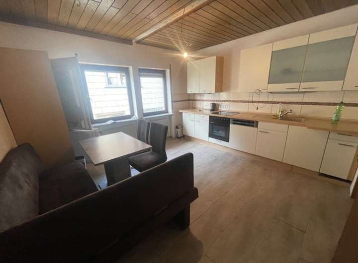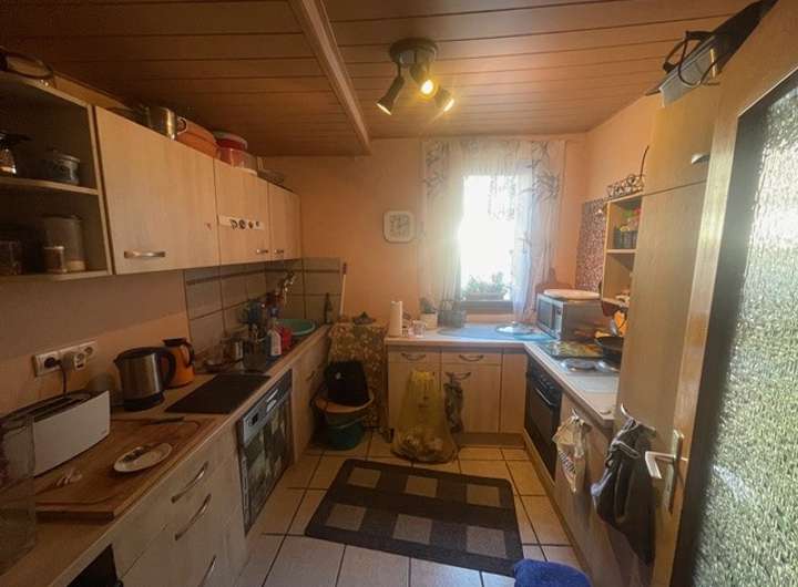 Sodann ist darüber liegend die kleien Wohnung vorhanden, die bisher genutzt war und auch an sich nutzbar ist (sollte nur mittelfristig renoviert werden) von 93 m2. Hierbei handelt es sich um eine Küche, Wohnraum, Schlafraum und Bad mit Zugang auf die Terrasse.