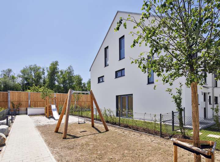 Spänner und 2 Doppelhaushälften, die sich harmonisch in die Umgebung einfügen - ein durchdachtes Konzept mit großzügigen Gärten, hochwertiger Vorbepflanzung und einem geplanten Spielplatz auf dem Grundstück.