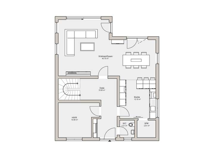 Offen gestaltet sich dann die Küche, die individuell planbar ist. Für weitere Abstellmöglichkeiten befindet sich eine Speisekammer an der Rückwand der Küche. Abgerundet wird das Erdgeschoss durch ein Gäste-WC und einen Hauswirtschaftsraum.