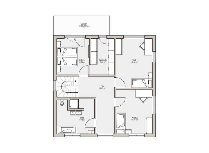 Über eine u-förmige Treppe gelangen Sie ins Obergeschoss der Stadtvilla Certo. Hier befinden sich zwei Kinderzimmer, ein Familienbad und der Elternbereich mit Ankleide und eigenem Balkon. Der Balkon kann durch den Erker im Erdgeschoss perfekt positioniert werden.