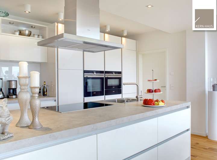 Lichtdurchflutete Stadtvilla – für das persönliche Wohnglück. Die Stadtvilla Certo von Kern-Haus überzeugt mit 161 m² Wohnfläche, die sich auf 4 Zimmer aufteilt. Bereits der Eingangsbereich begrüßt Sie mit schönen Details, wie einer Nische für eine Garderobe und eine Glastür, die Sie ins Herzstück des Hauses führt: der offene Wohnbereich mit zahlreichen Fenstern. Im Wohnerker findet eine schöne Couch Platz – der helle Raum eignet sich zum Entspannen am Tag und auch am Abend. Von hier führt der Weg auch in den Garten. Daran schließt der Esstisch in einer ebenfalls mit Fenstern versehenen Ecke an. Hier kommt die Familie gerne zusammen.