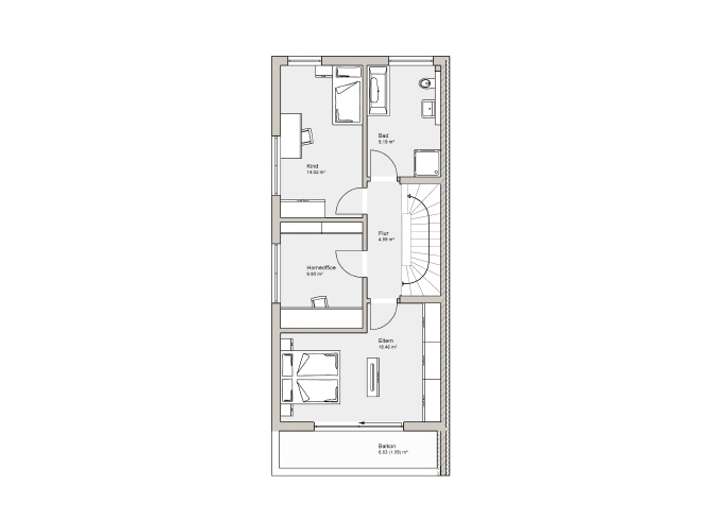 In der linken Doppelhaushälfte mit 112 Quadratmetern sind im Obergeschoss ein Elternschlafzimmer, ein Kinderzimmer, ein Home-Office und ein Badezimmer untergebracht. Das Elternschlafzimmer verfügt über einen Zugang auf den Balkon. Die rechte Doppelhaushälfte ist mit 119 Quadratmetern etwas größer und umfasst zwei Kinderzimmer, ein Elternschlafzimmer mit Ankleide sowie ein Badezimmer. Durch bodentiefe Fenster werden die Räume zur Gartenseite sowohl im Erd- als auch im Obergeschoss lichtdurchflutet. Linum ist durch seine Außenmaße ideal für schmale Grundstücke geeignet.