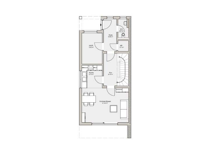 Durch einen überdachten Eingangsbereich gelangen Sie trockenen Fußes in Ihre moderne Doppelhaushälfte im Bauhausstil. Einkäufe können Sie direkt neben dem Eingang im Hauswirtschaftsraum oder im Abstellraum unterbringen. Das Massivhaus überzeugt durch eine offene Raumkonzeption von der Küche hin in den Wohn- und Essbereich. Die rechte Doppelhaushälfte verfügt über einen Erker, der die Küche und das Wohnzimmer vergrößert. Das Erdgeschoss wird ergänzt durch ein Gäste-WC im Eingangsbereich.
