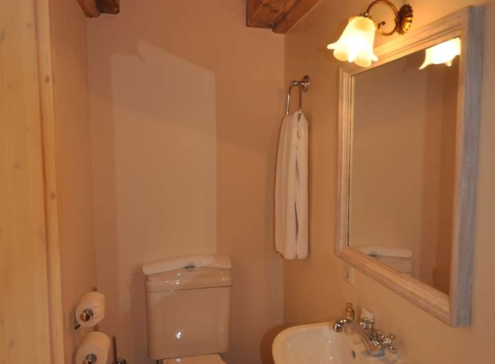 Drei Schlafzimmer, eine Wohnküche, ein Gästebad mit Dusche, ein Vollbad mit Doppelwaschtisch, Dusche und freistehender Badewanne, spanische Zementfliesen, geweißte Holzdielenböden, Kaminofen, Einbauküche im Landhausstil (ohne Elektrogeräte), Sichtbalken, Küchentür zur Terrasse seitlich am Haus, Pkw-Stellplätze, Glasfaseranschluß, Isolierverglasung. Die Wohnung wird unmöbliert vermietet. Die Wände sind weiß gestrichen, nur der Küchenbereich ist mit einem gemütlichen Karminrot gemalt worden.