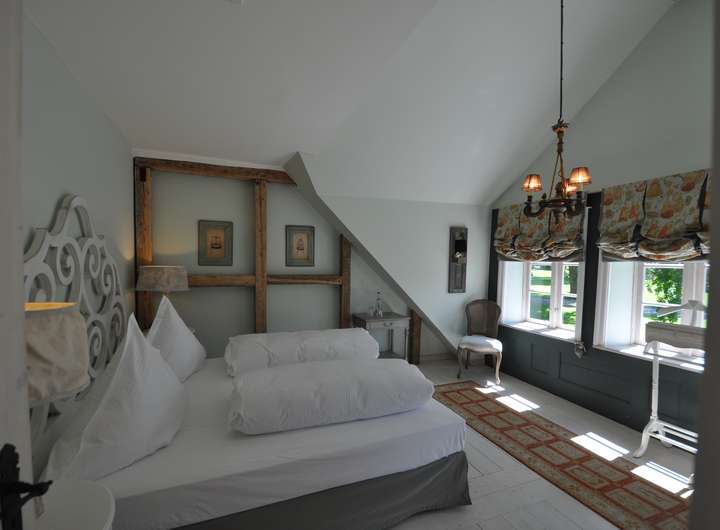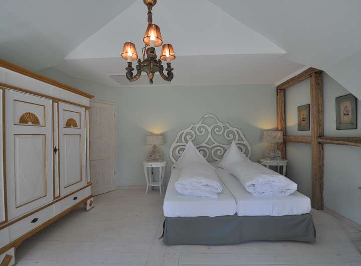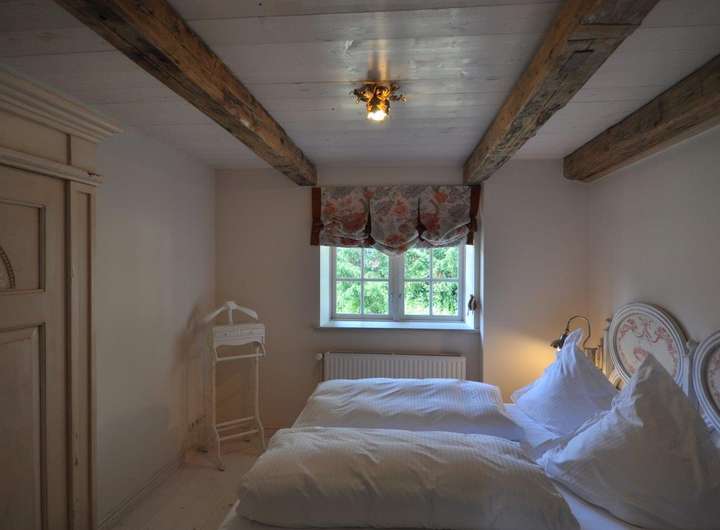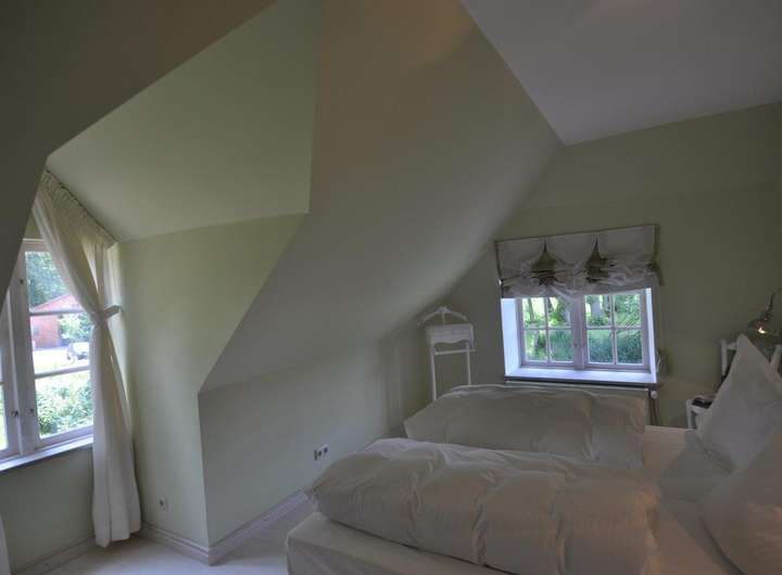 Die Fenster, in der Gutstischlerei aus hiesigem Eichenholz gefertigt, sorgen für passenden stiltreuen Ausblick mit Sprossen und moderner Isolierverglasung. Eine Holztreppe führt in das Obergeschoß. Der Spitzgiebel ist in dem Schlafzimmer sichtbar und sorgt für Großzügigkeit und Gemütlichkeit.