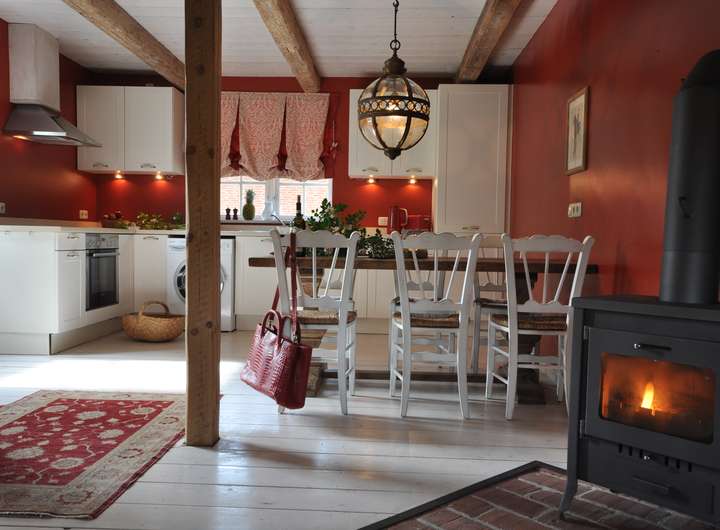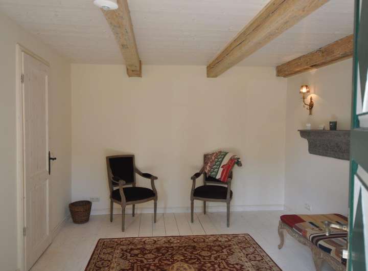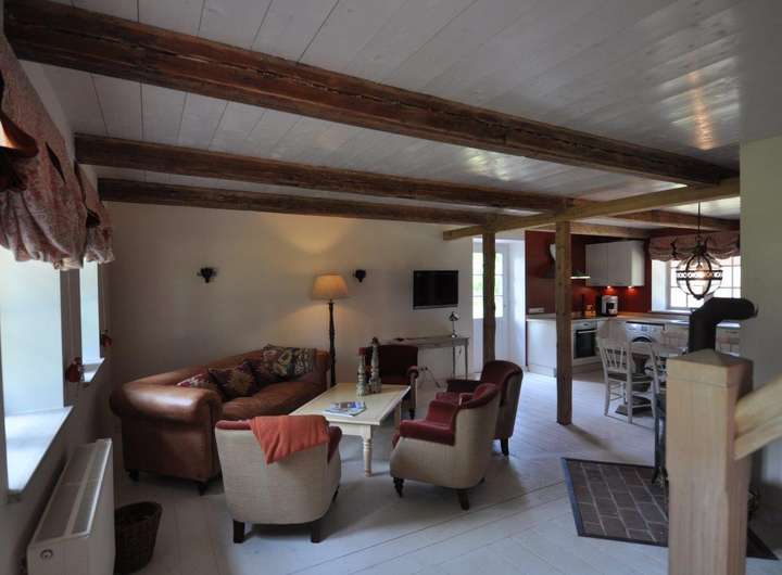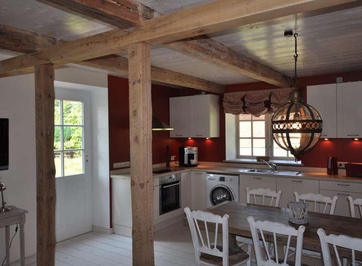 Das Gebäude ist geprägt von rustikalen Holzbalken, gemütlich, wie man es von einem alten Fachwerkhaus erwartet. Die Einbauküche (ohne Elektrogeräte) im Landhausstil bietet ausreichend Platz für eine gemütliche Sitzecke und geht direkt ins Wohnzimmer über.