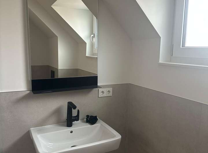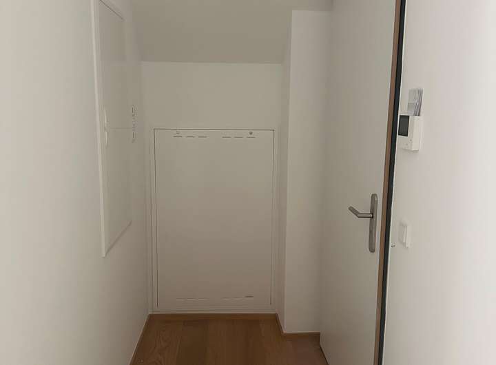 Beim Betreten der Wohnung empfängt Sie ein einladender Flur mit Garderobenbereich. Folgen Sie dem Flur, finden Sie auf der rechten Seite das stilvoll gestaltete Badezimmer. Auf rund 6 m² bietet es eine moderne Dusche, ein Waschbecken sowie eine Toilette – perfekt, um entspannt in den Tag zu starten.