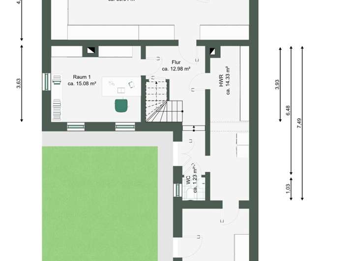 Im Erdgeschoss befindet sich die Ladenfläche von ca. 67,39 m². Der großzügige, lichtdurchflutete Vorraum mit moderner Fensterfront bietet ideale Präsentationsmöglichkeiten für nahezu jedes Geschäftskonzept. Dahinter liegen ein separater Behandlungs- bzw. Büroraum, ein Kunden-WC sowie ein großzügiger Hauswirtschaftsraum, der sich – nach individuellem Ausbau – ebenfalls als zusätzlicher Raum für Kunden oder Mitarbeiter anbieten kann.