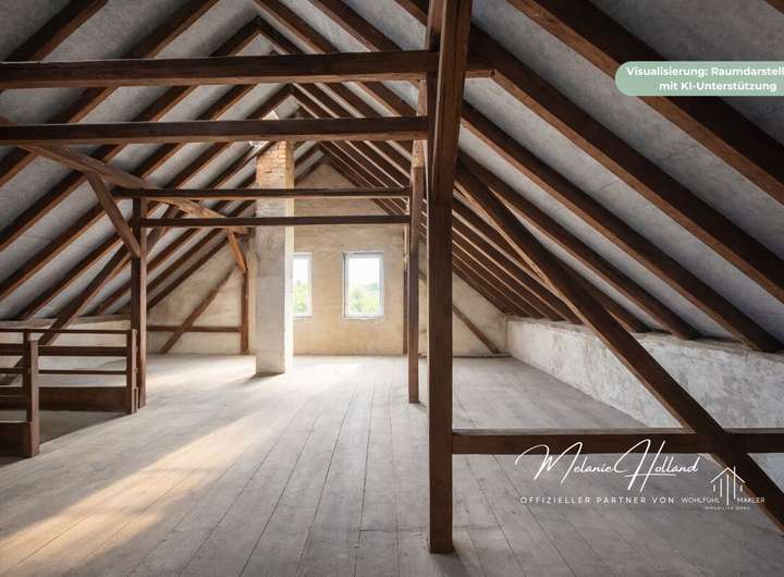 Das Dachgeschoss stellt das besondere Highlight des Hauses dar: Auf ca. 83,81 m² ausbaufähiger Fläche eröffnet die beeindruckende Raumhöhe die Möglichkeit, eine stylische Loft-Wohnung oder ein großzügiges Atelier zu realisieren (vorbehaltlich behördlicher Genehmigung). Ein Ort, an dem Visionen zu Wohn- oder Arbeitsräumen mit besonderem Flair werden können.