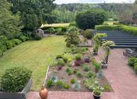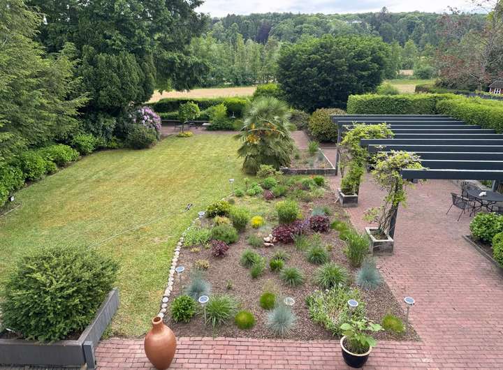 Das 1887m² große, herrlich gestaltete Grundstück liegt direkt an der Bebauungsgrenze mit unverbaubarem Blick ins Grün.