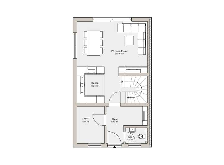 Im Erdgeschoss befinden sich neben Küche und Wohn-Esszimmer auch ein Gäste-WC, der Hauswirtschaftsraum und eine praktische Garderobe.