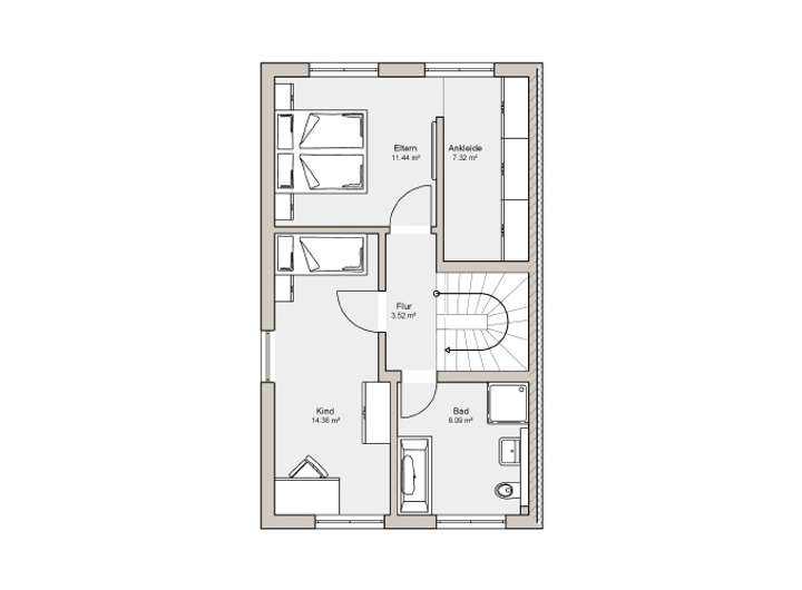 Das Obergeschoss beherbergt entweder ein großes Elternschlafzimmer mit Ankleide und ein Kinderzimmer (Variante links) oder drei Kinderzimmer (Variante rechts). Das Highlight ist ein großes Badezimmer für die ganze Familie.