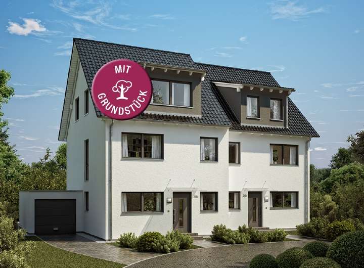 Der gezeigte Preis versteht sich inklusive Grundstück und exklusive der Baunebenkosten und bezieht sich auf die Variante links des Hauses.