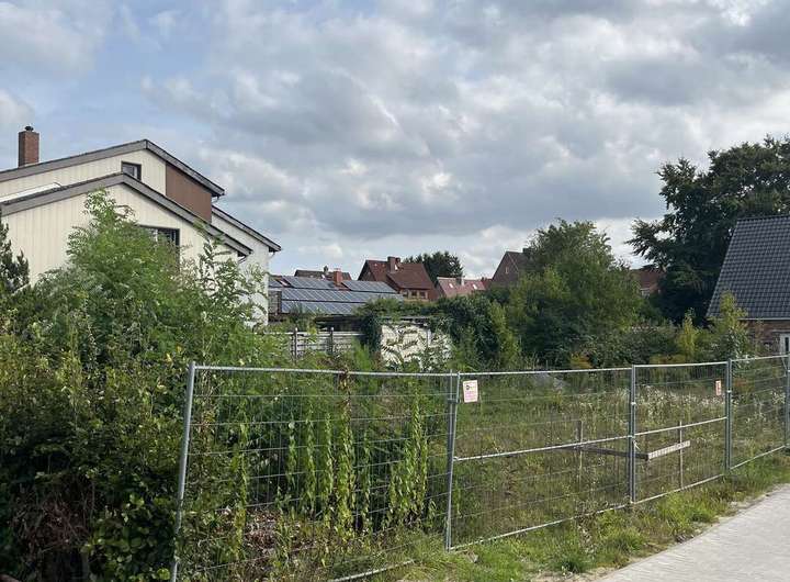 Das Grundstück ist bis auf ein paar Büsche und Sträucher, weitestgehend geräumt und mit einem Bauzaun gesichert.