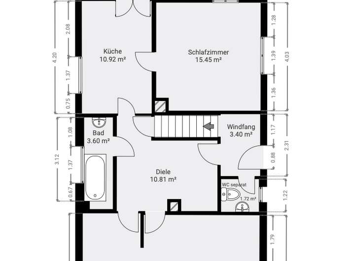 Ein Schlafzimmer, ein Badezimmer mit Wanne und Waschbecken sowie ein separates WC runden das Erdgeschoss ab.