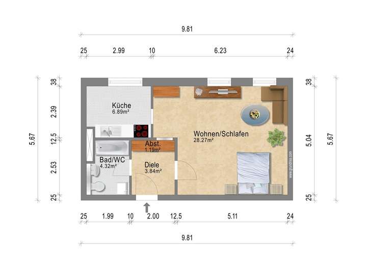 Die 1-Raum Wohnung verfügt über ein separates Kellerabteil.